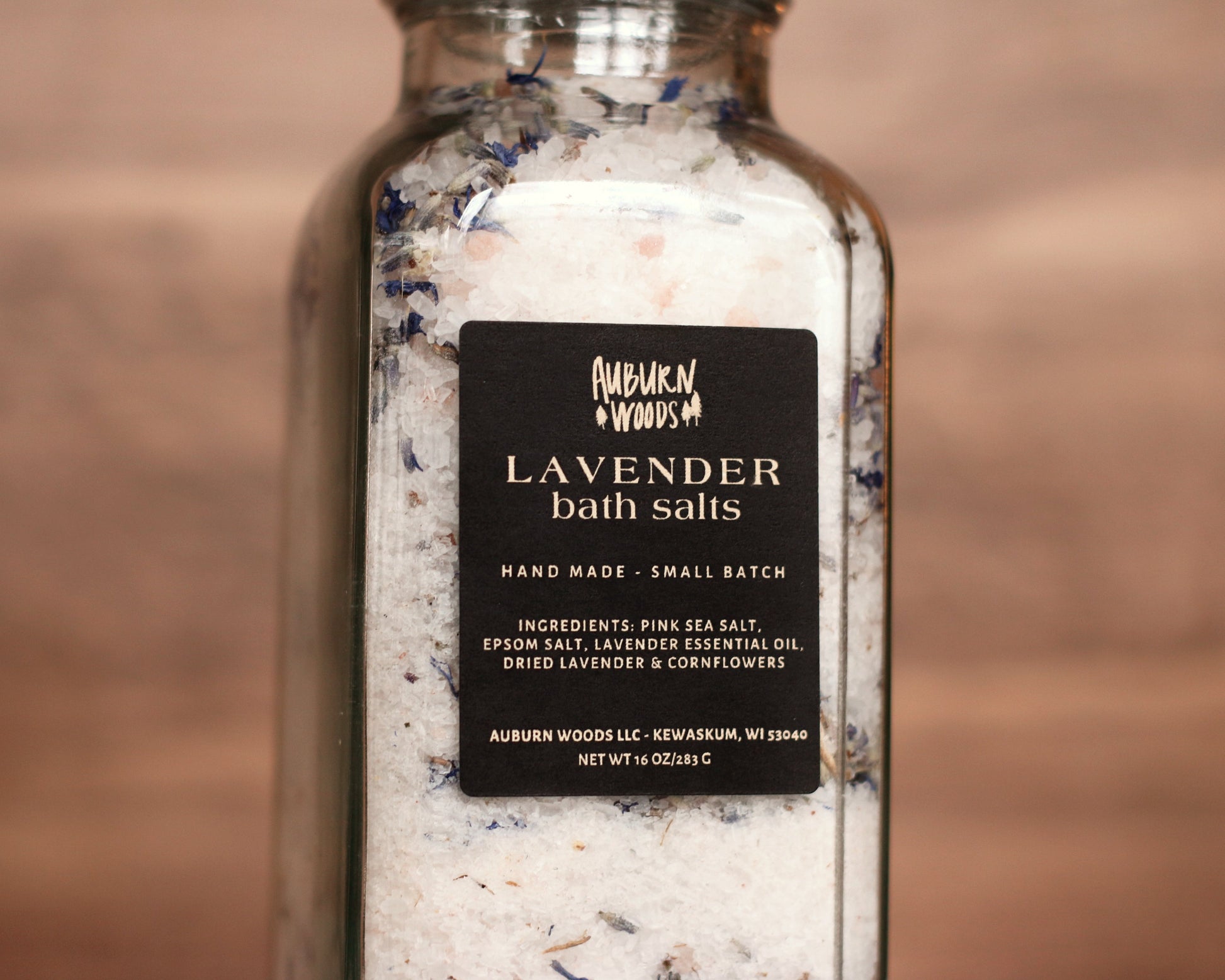 Lavender Bath Salts: Ingredients: Epsom Salt, Pink Sea Salt, Lavender Essential Oil, Dried Lavender & Cornflower Petals