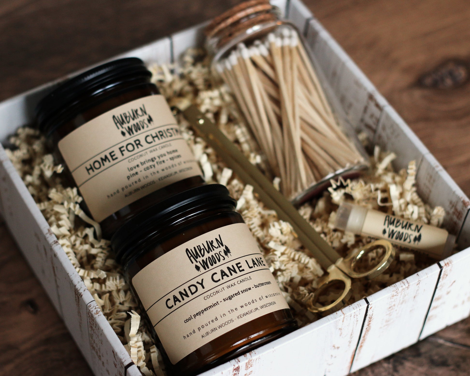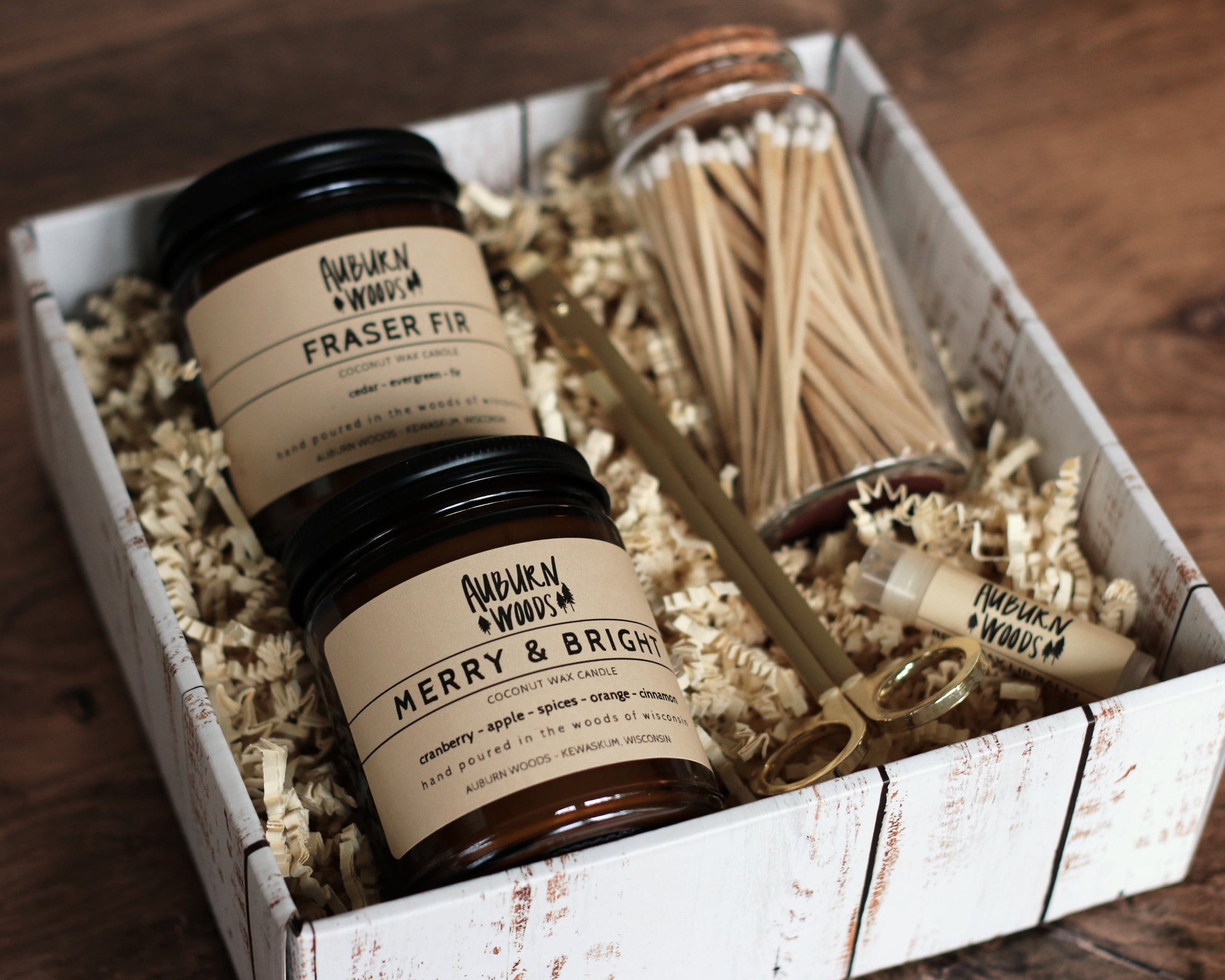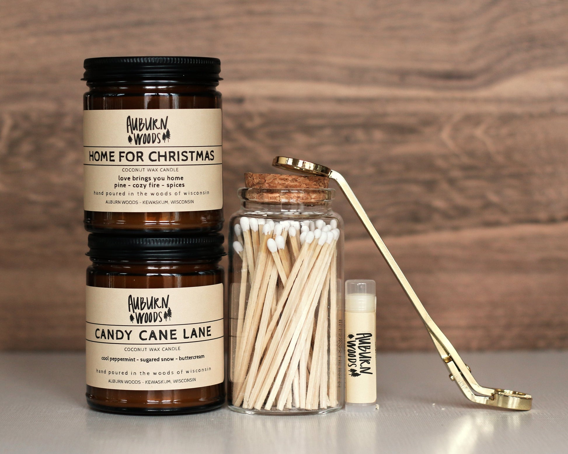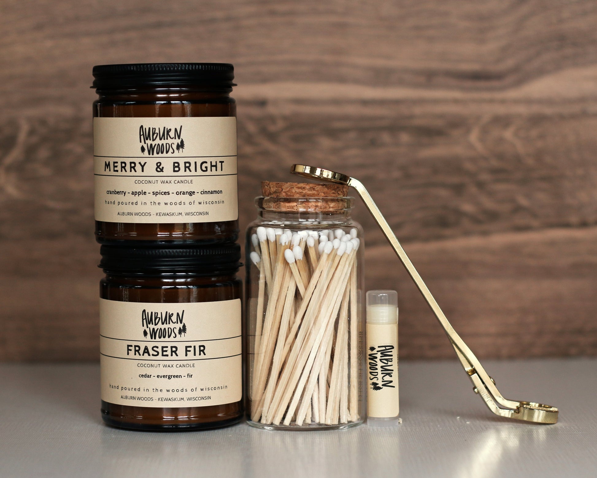 Two 8oz amber jars, safety matches in a glass jar (strike on bottom), a wick trimmer, and peppermint lip balm all tucked in a gift box with a ribbon. ($62 value)