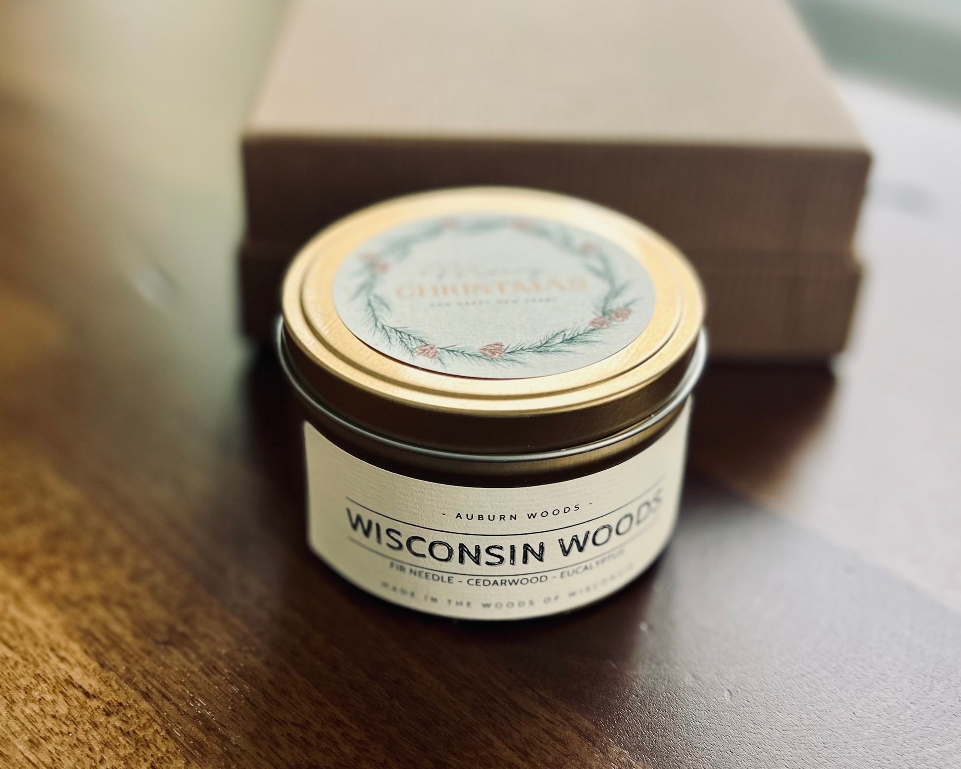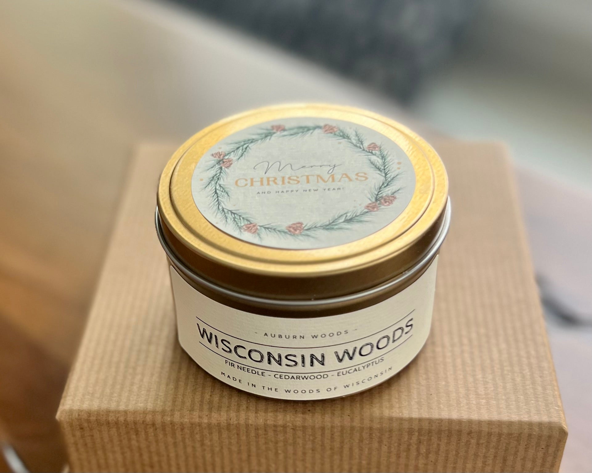 Wisconsin Woods is by far our best selling candle year round - enjoy this favorite scent in a festive gold tin with a Merry Christmas wishes