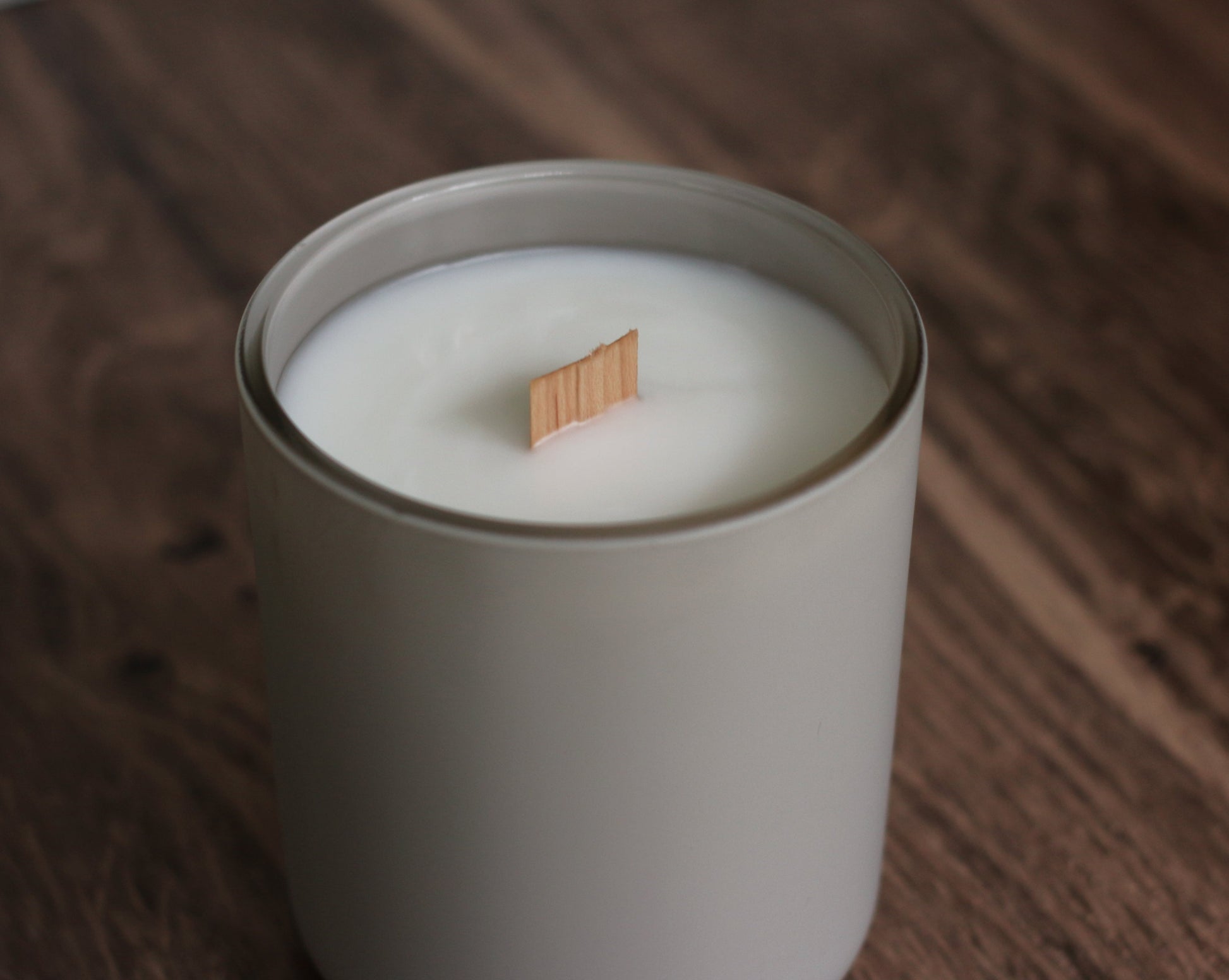 Colors: stonewash, and umber (brown) matte finish jars. The wooden wick has a soft crackle sound.